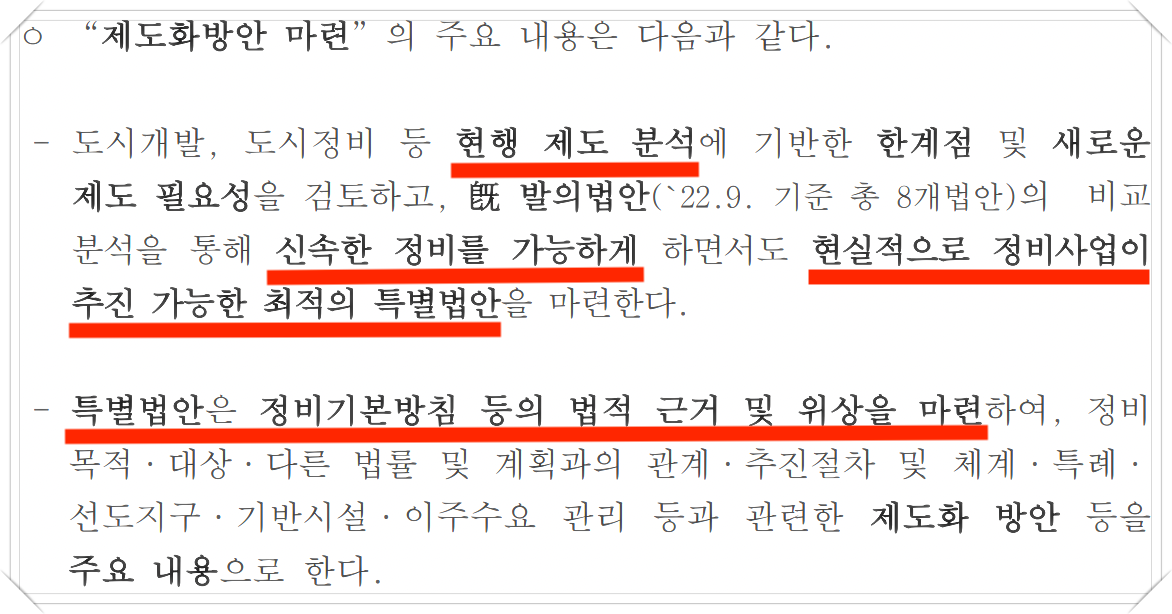 이렇게 정비 기본방침과 특별법 제정에 중점을 두고 있는 것이 이번 용역의 내용이라고 볼수있을것 같구요!