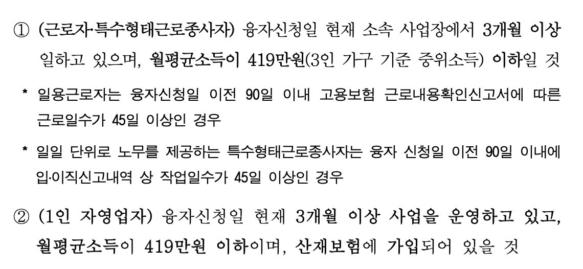 - 근로자나 특수형태 근로 종사자의 경우에는 융자를 신청하는 날부터 소속 사업장에서 3개월 이상을 일하고 있어야 하며