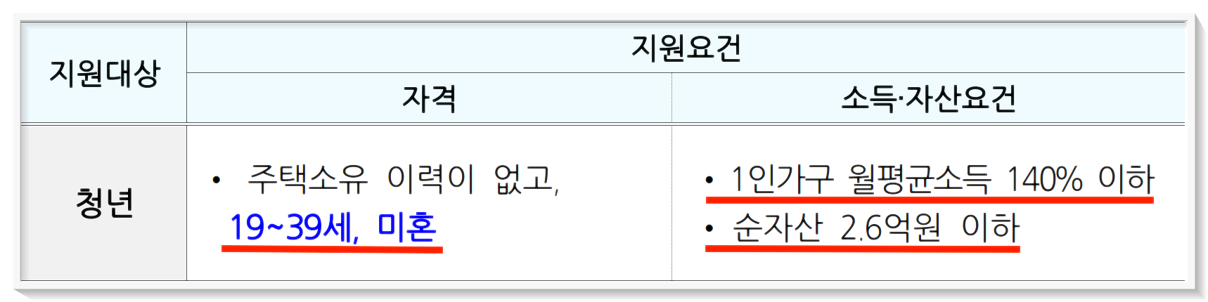 미혼 청년 특공 지원대상을 알아보면 19~39세의 나이 제한이 있고 미혼일것을 자격으로하고있습니다. 그리고 속득이 월평균소득의 140% 이하이고 순자산은 2.6억원 이하 일것을 요건으로 두고 있습니다.