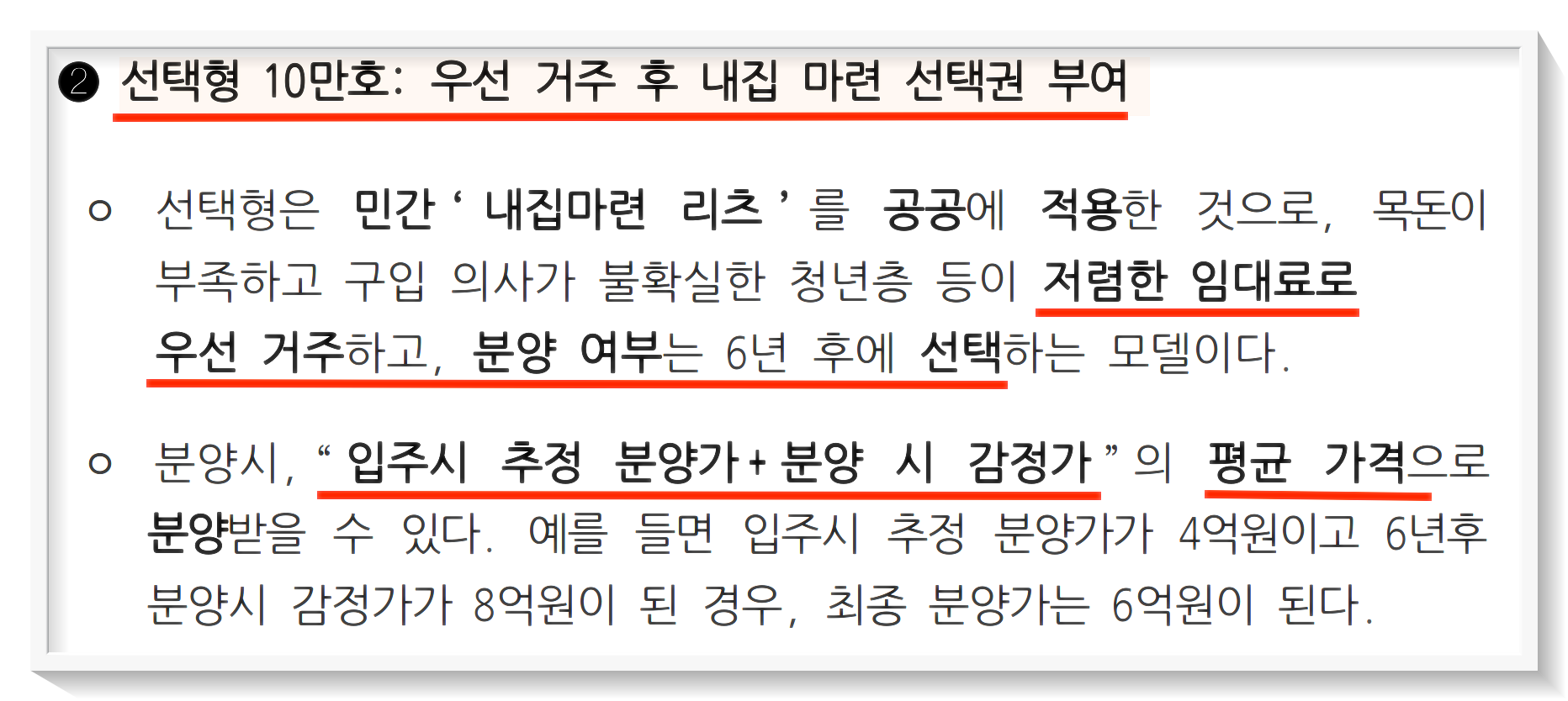 선택형은 내집 마련을 하기 앞서서 우선 임대로 거주하다가 분양여부를 6년후에 선택한다는 점에서 기존의 분양과 매우 차별화되는 유형이라고 할수 있습니다. 저렴한 임대료로 무려 6년간 거주할수 있고 분양을 결정한 후, 주택 가격이 많이 올라도 부담을 줄일수 있기 때문에 장점이 많은 유형이라고 할수 있겠습니다. 사실 미혼 청년에게는 제일 맞는 유형이지 않을까 싶습니다.