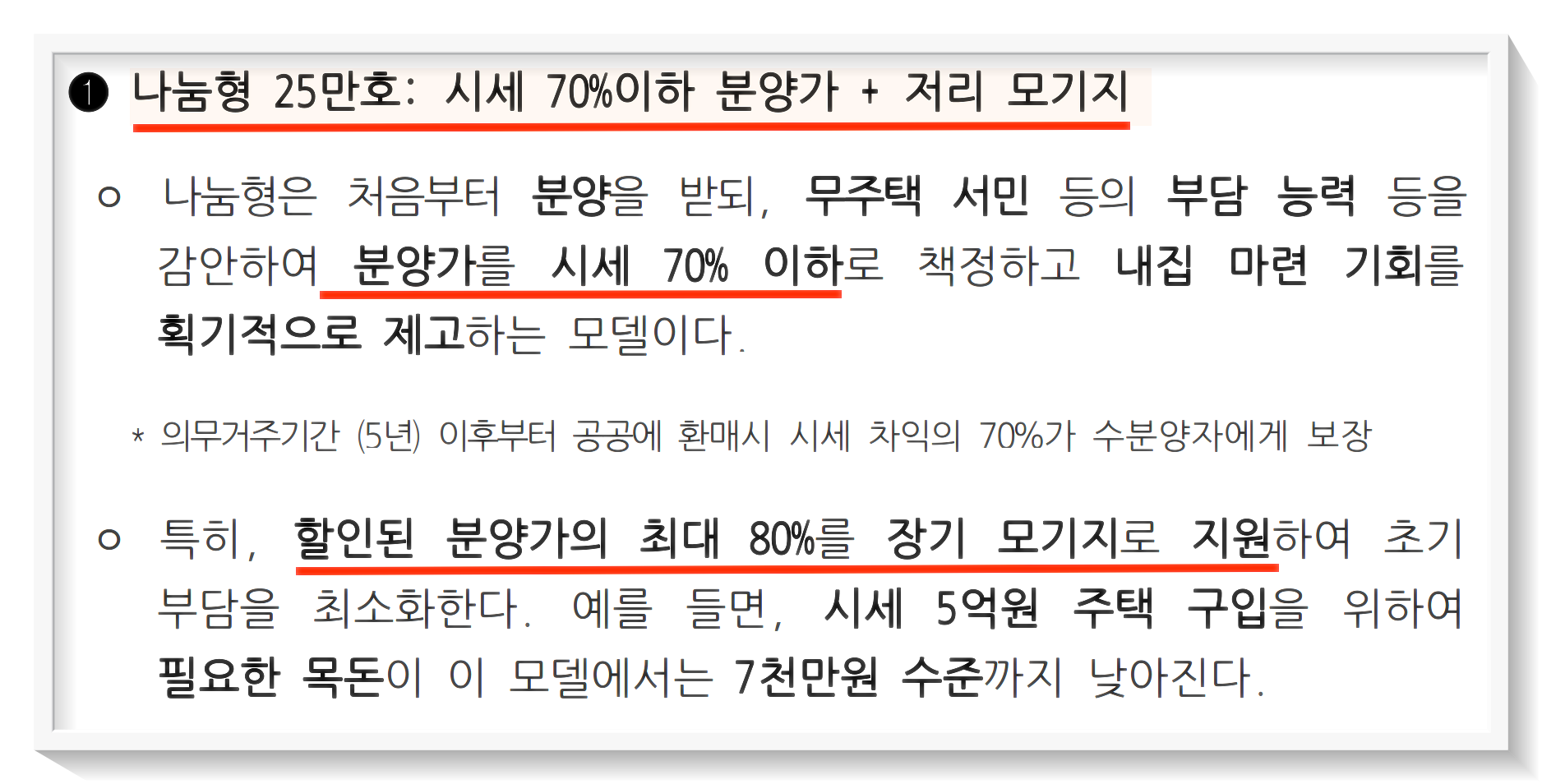 나눔형이라는 말은 처음에 분양을 받을 당시 부담을 최소화 하는 방식을 말합니다. 우선 처음에 분양가를 시세의 70% 이하로 책정합니다. 그리고 이렇게 낮게 책정된 분양가에서 80%를 장기 모기지로 지원을 받습니다. 즉 처음에 들어갈 자금은 주택 분양가를 시세의 70%로 잡아도 70% x 20% = 14% 정도로 매우 낮은 수준이라고 볼수있는 공급 유형입니다.