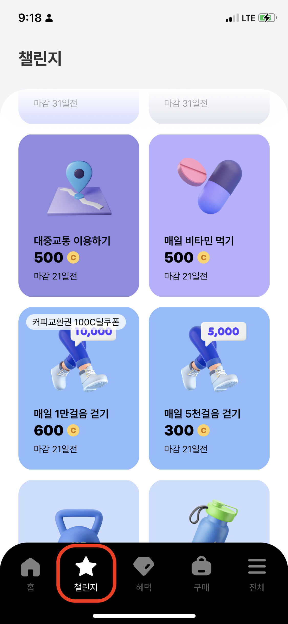 하단에 있는 챌린지 버튼을 누르면 이렇게 일상적인 챌린지 내용들을 볼수있는데요.