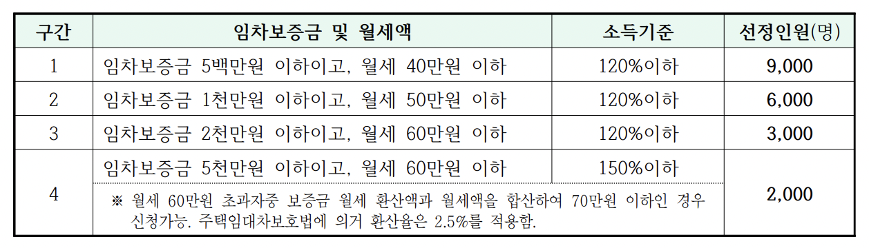 | 3 | 임차 보증금 2000만원 이하, 월세 60만원이하 | 120% 이하 |