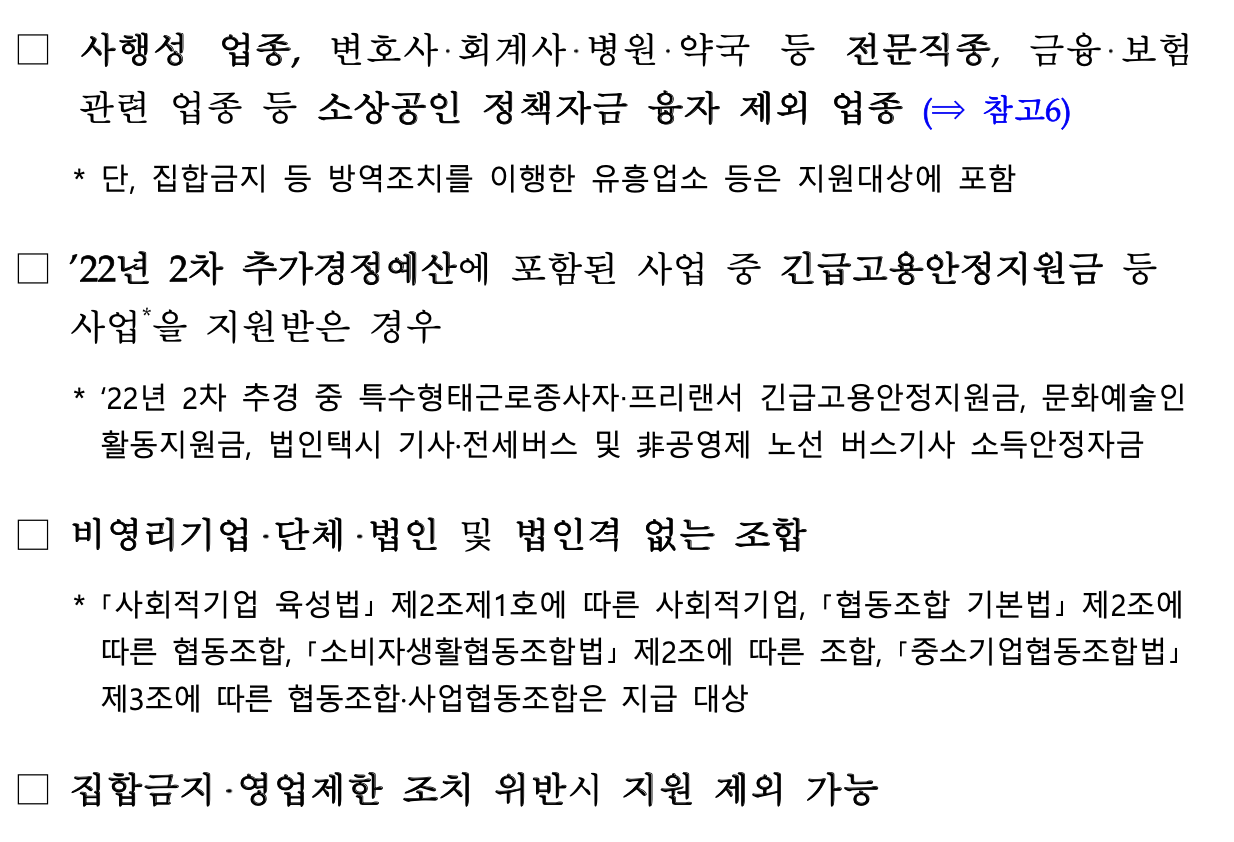 그리고 사행성 업종, 변호사, 회계사, 병원, 약국 등 전문직종 이거나 금융, 보험 관련업종 등 소상공인 정책자금 융자 제외 업종은 지원금에서 제외됩니다. 그밖에도 추가경정예산에 포함된 사업중에서 긴급고용안정 지원금 등의 사업을 지원받은 경우, 비영리 기업 단체 법인 등, 집합금지, 영업제한 조치 위반시에도 지원에서 제외됩니다.