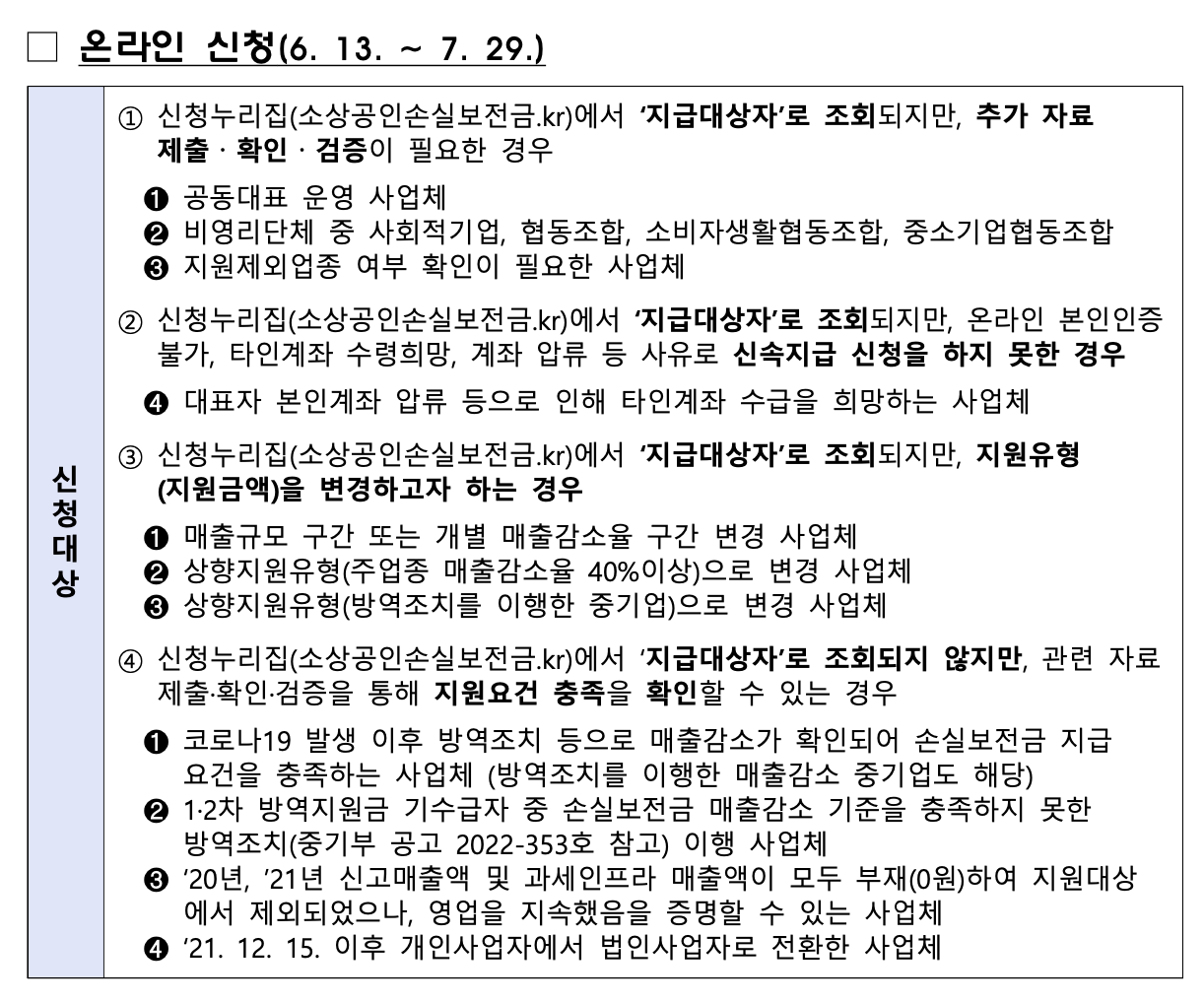 온라인 신청 대상은 위와 같습니다. 그냥 간단하게 생각하시면 일반적인 손실보전금 대상이라고 생각하시면 되겠습니다. 누리집 홈페이지에서 개인정보 활용 등 동의서에서 체크해주시고 사업자 등록번호를 입력하신후 간단한 본인인증 이후 신청정보를 입력하시면 됩니다. 이러게 요건이 확인되고 지급 대상여부가 최종확인되면 계좌에 입금되게 됩니다.