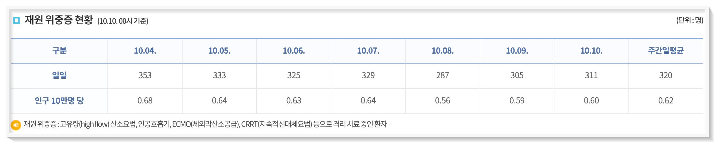 그리고 사망, 신규입원 현황 모두 감소했지만 재원 위증증 현황 만은 증가한것으로 파악되었습니다. 입원중인 위중증 치료자들은 어제보다 6명이 늘어난 311명이 되었다고 합니다.
