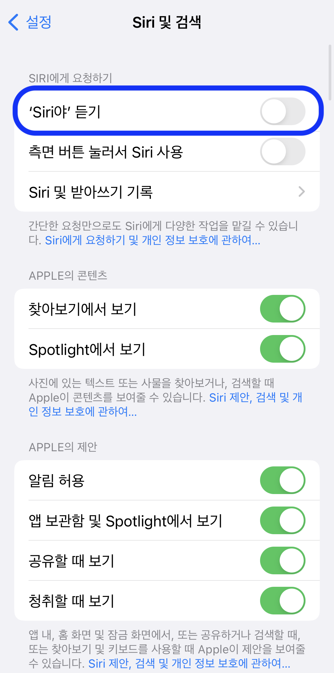 여기에서 'Siri야' 듣기를 켜주시면 되구요.