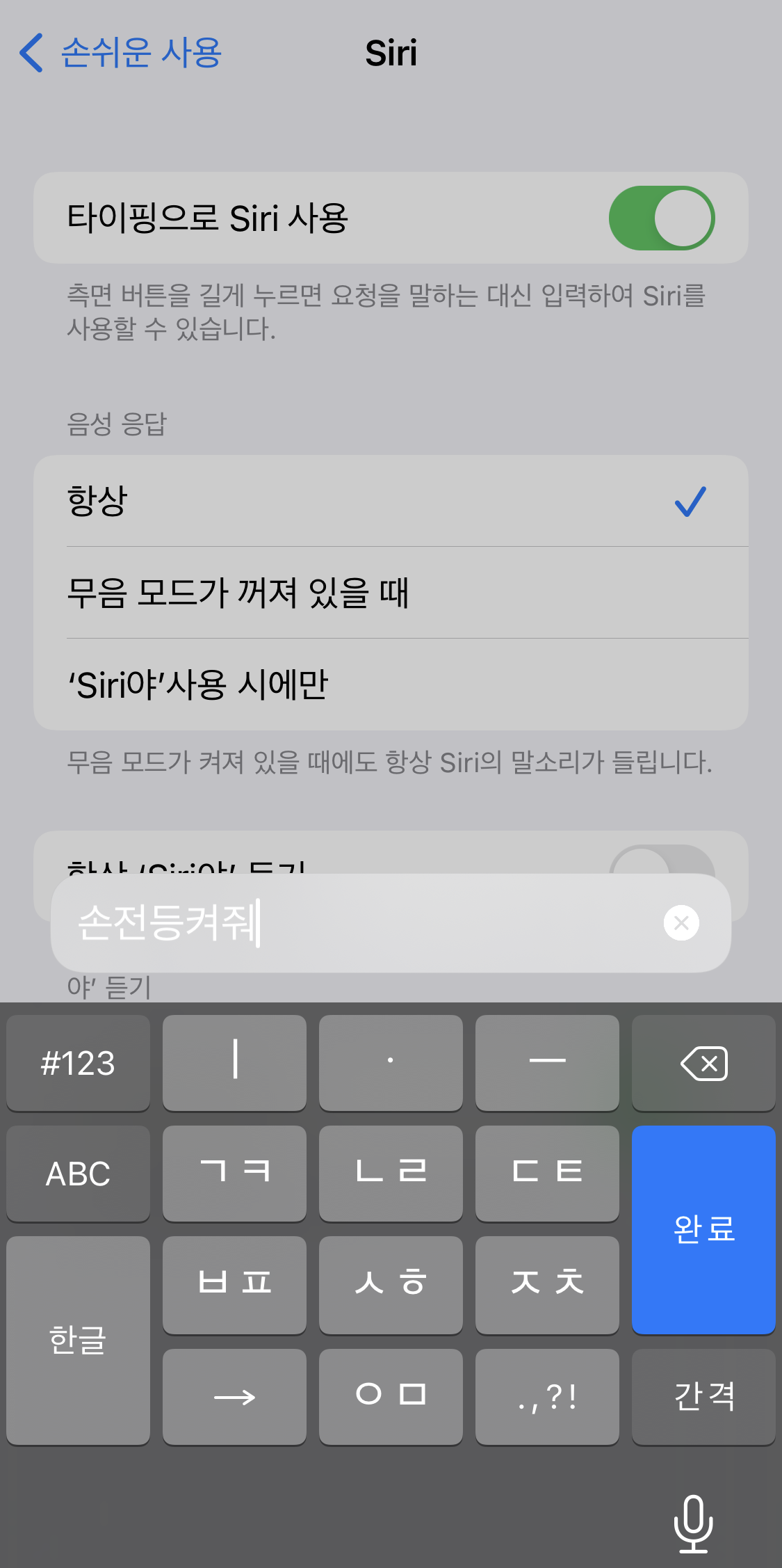타이핑으로도 시리 사용할수 있습니다.
