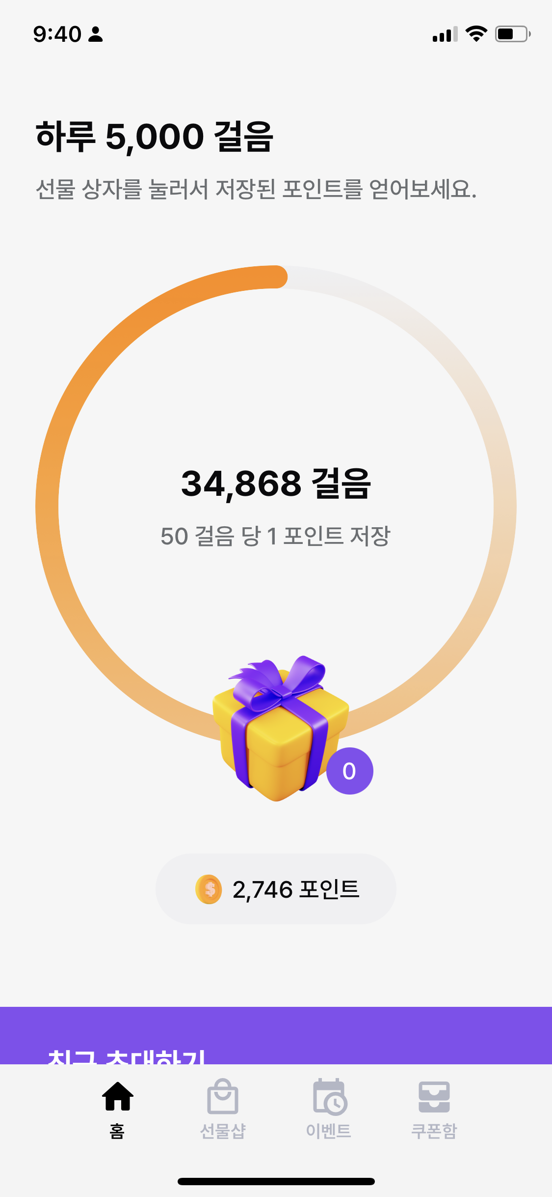 하루에 총 5000 걸음을 걸을 경우에 100 점이 쌓이게 되구요.