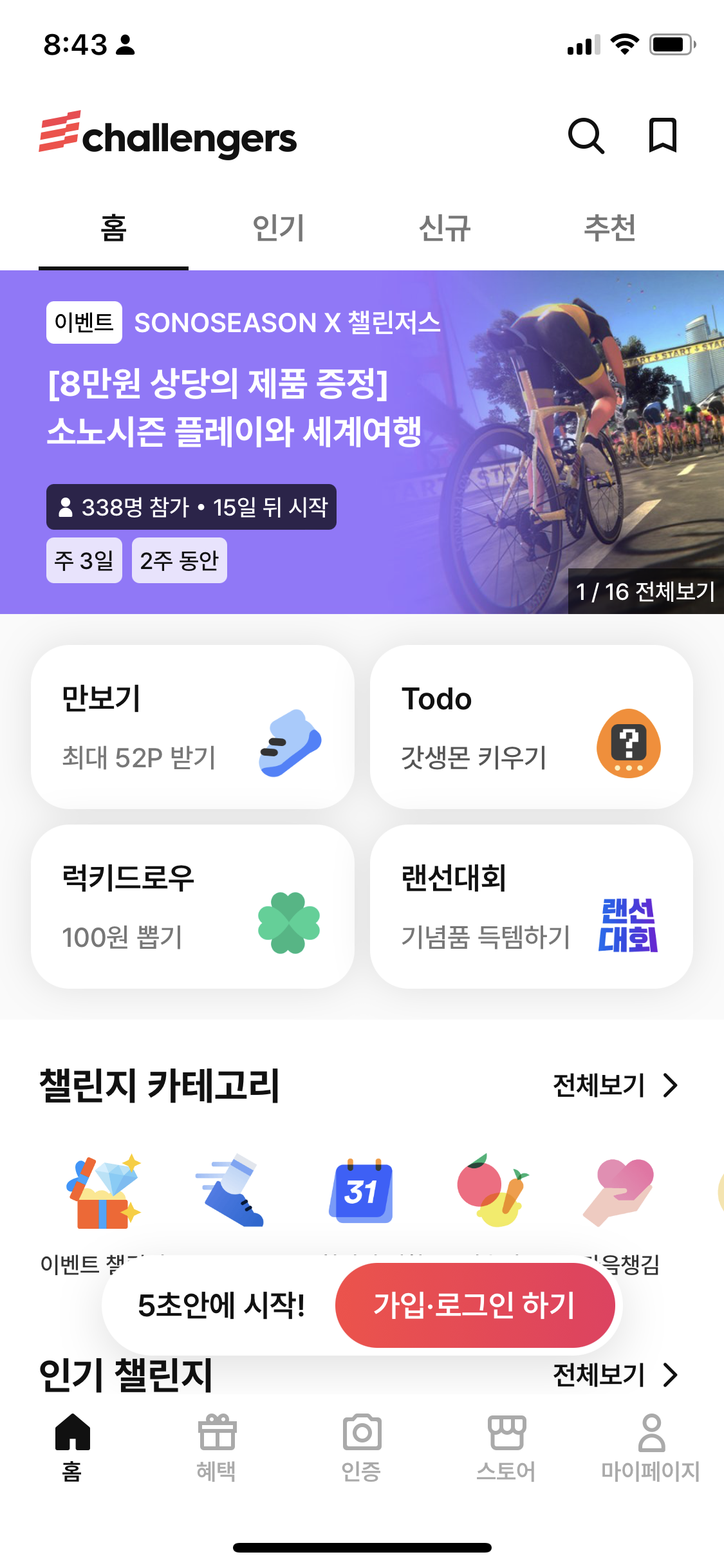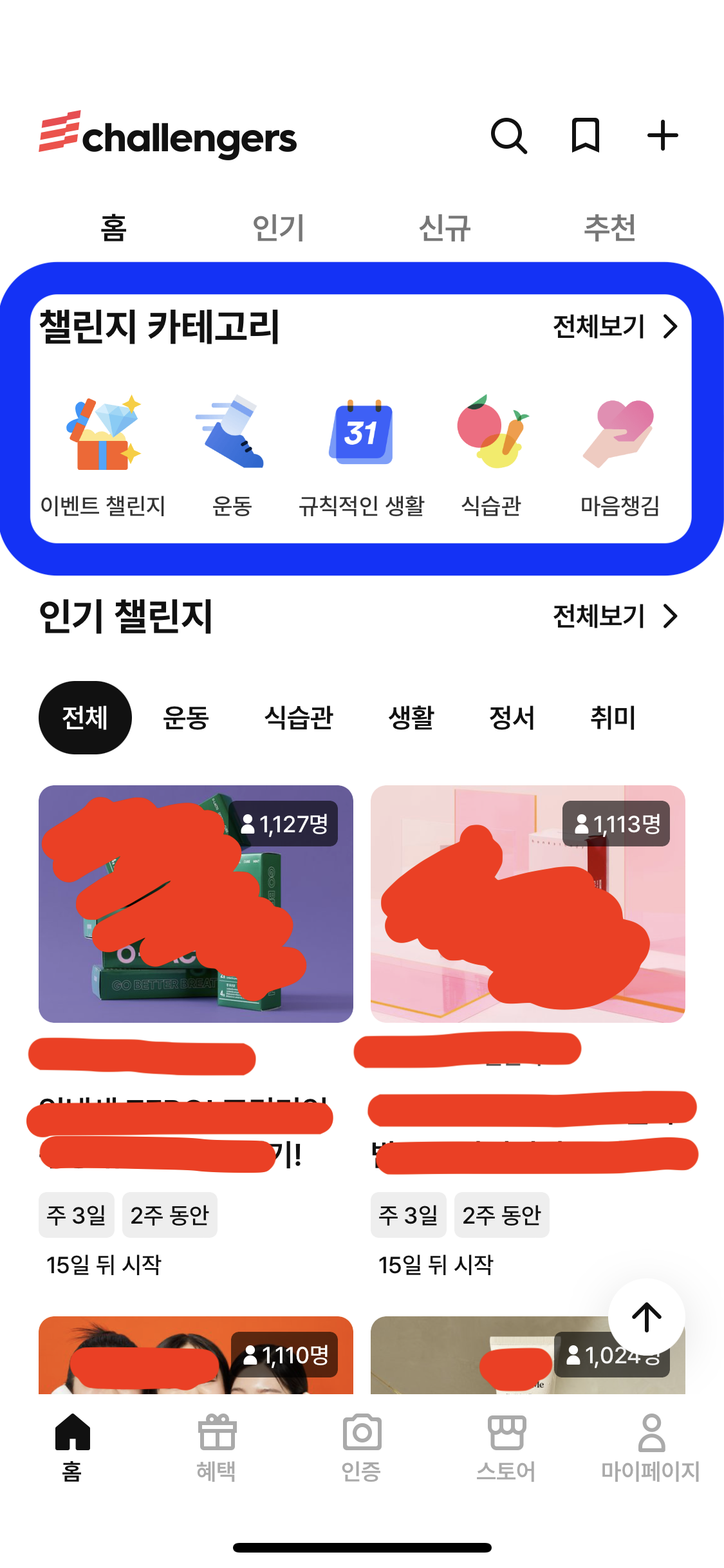 첫기본화면 부터 다양한 챌린지 내용들이 쭉 나열되어있는 것을 확인할수있는데요!