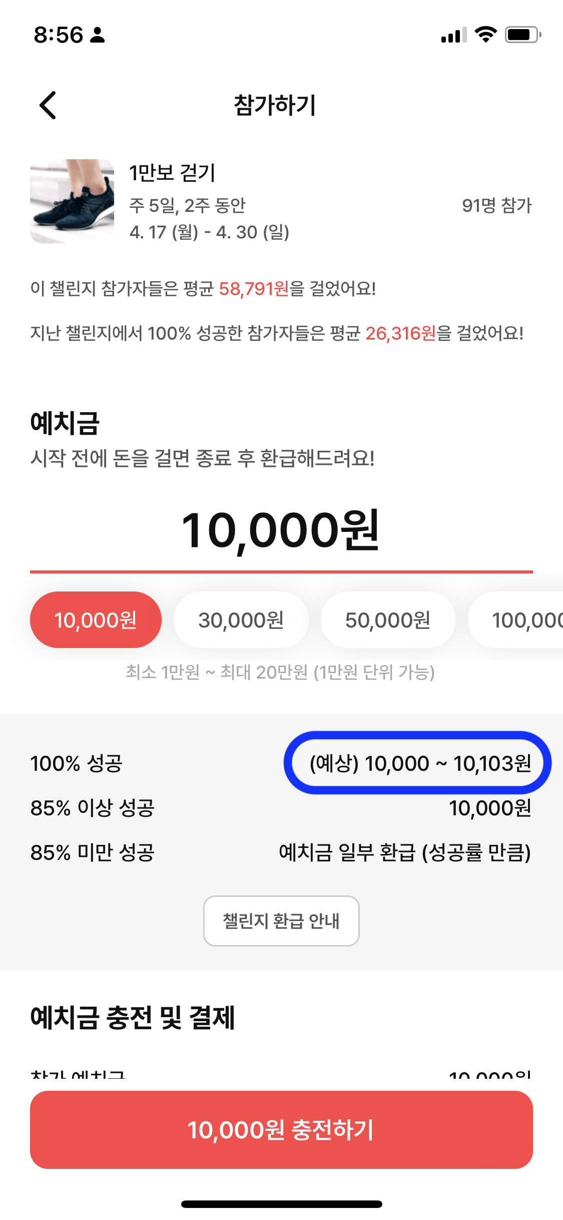 보니까 1만 을 예치금으로 넣어두면 100% 만보를 2주동안 성공할 경우 10103 을 벌수 있고 20만을 걸게되면 2053의 수익을 낼수있는것으로 확인이 가능하네요! (아.. 솔직히 좀 짜다는 생각이 ㅎㅎㅎ)