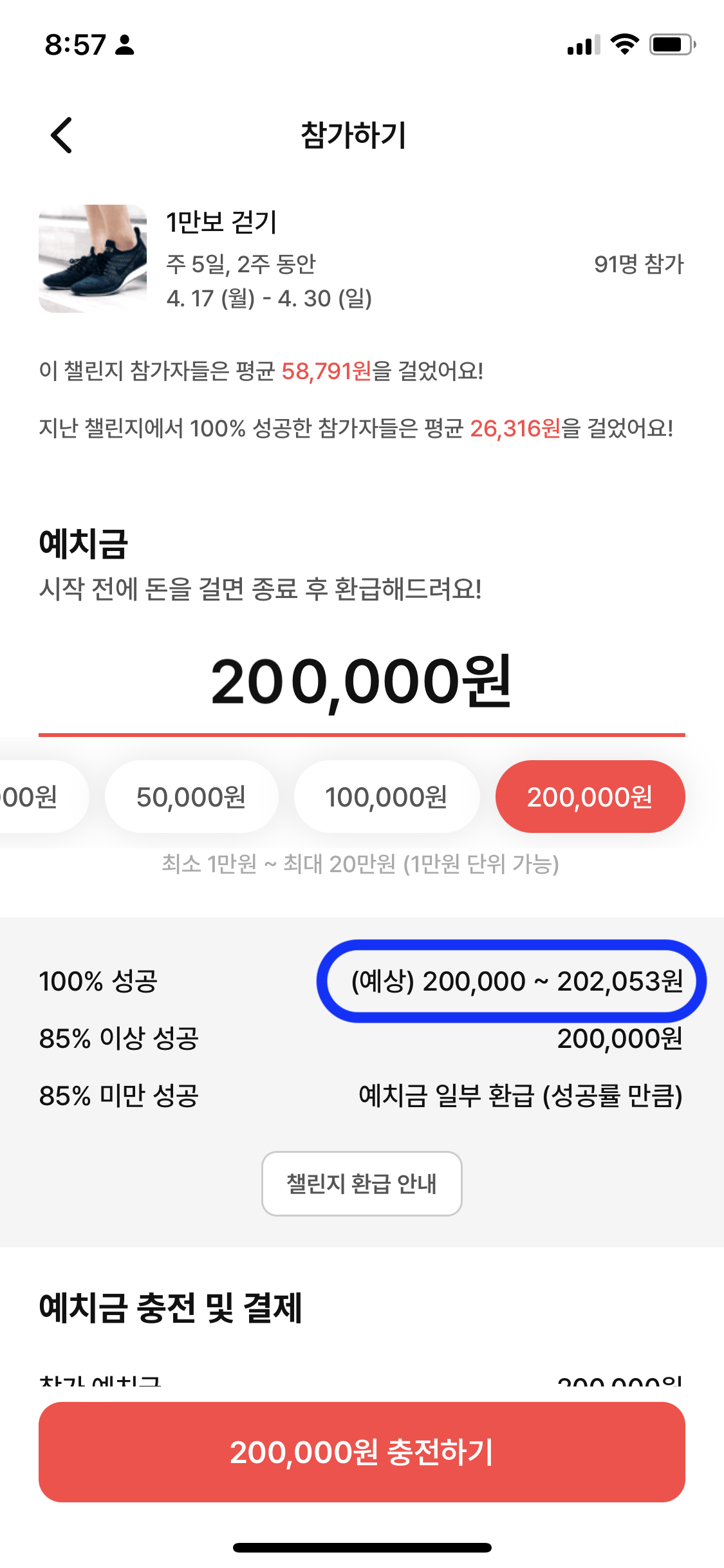 참가하기를 누르면 이제 예치금을 넣어야 챌린지에 본격적으로 참여할수 있게 됩니다.