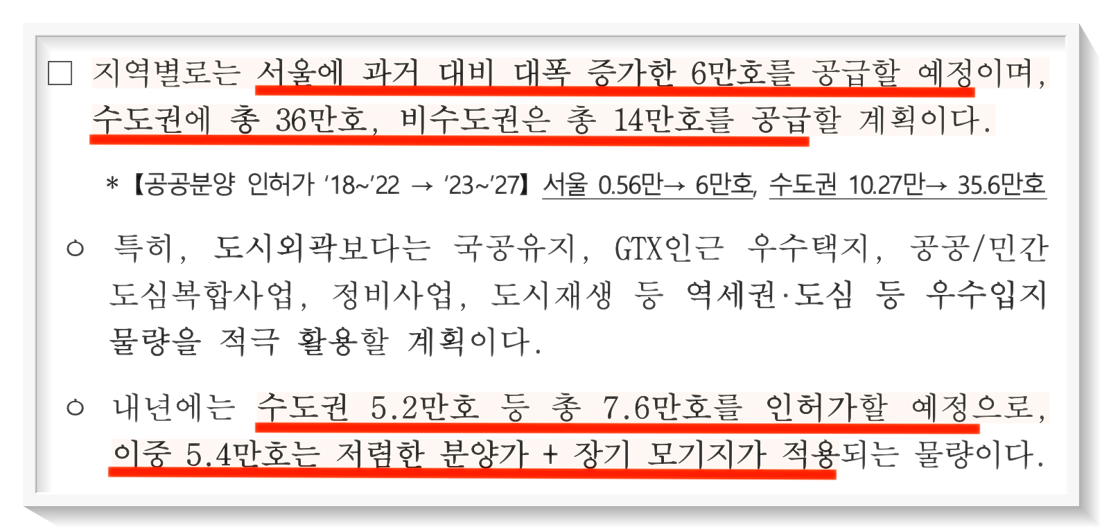 지역별로 얼마나 공급되는지 알아보자면 서울의 경우 6만호가 공급되며 수도권에는 35.6만호 비수도권은 14만호를 공급할 예정이라고 합니다. 그리고 내년에 인허가될 7.6만호 중에서 5.4만호는 저렴한 분양가나 장기 모기지가 적용되기때문에 더더욱 내집마련의 부담을 줄일수 있을것으로 보입니다.