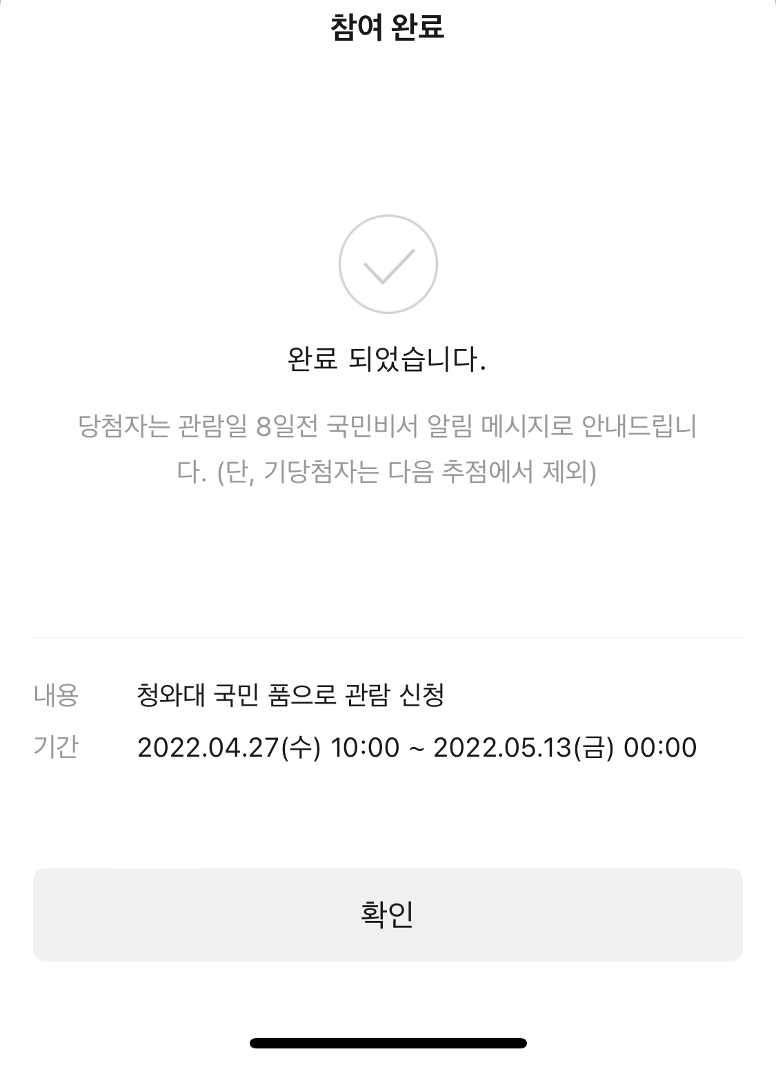 이 상태에서 제출하기를 누르면 이렇게 청와대 개방 관람신청이 끝이 납니다.