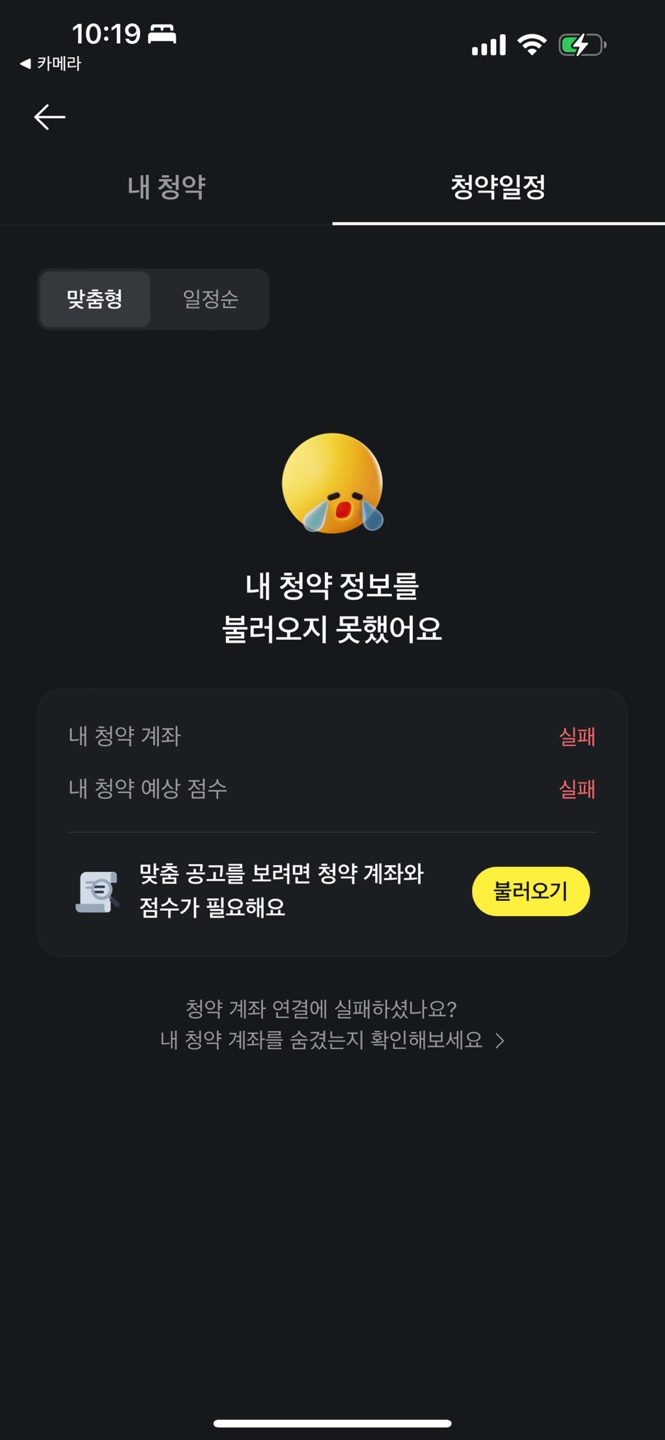 위에 올린 경로에 들어가게 되면 카카오페이 실행화면을 바로 볼수 있습니다. 청약일정을 가장 최근 부터 쭉 모아서 보는것이 가능합니다. 저는 청약 통장 연결을 해놓지 않았기 때문에 맞춤형 청약일정은 확인하는 것이 안되었는데요.