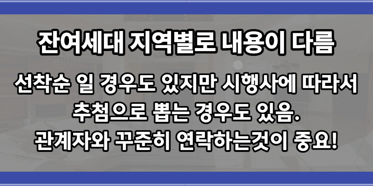 잔여세대는 정말 선착순으로 뽑히는 경우도 많습니다. 그렇기 때문에 청약에 낙첨하여 집에 가는길에 혹시 하는 마음에 분양 사무실에 들렸다가 덜컥 분양권을 얻게 되는 경우들도 있습니다. 관계자 분들과 좋은 관계를 유지하며 꾸준히 연락을 하여 시시각각 상황을 전해들으시면 좀 더 분양권을 받을 확률이 높아질 것입니다.