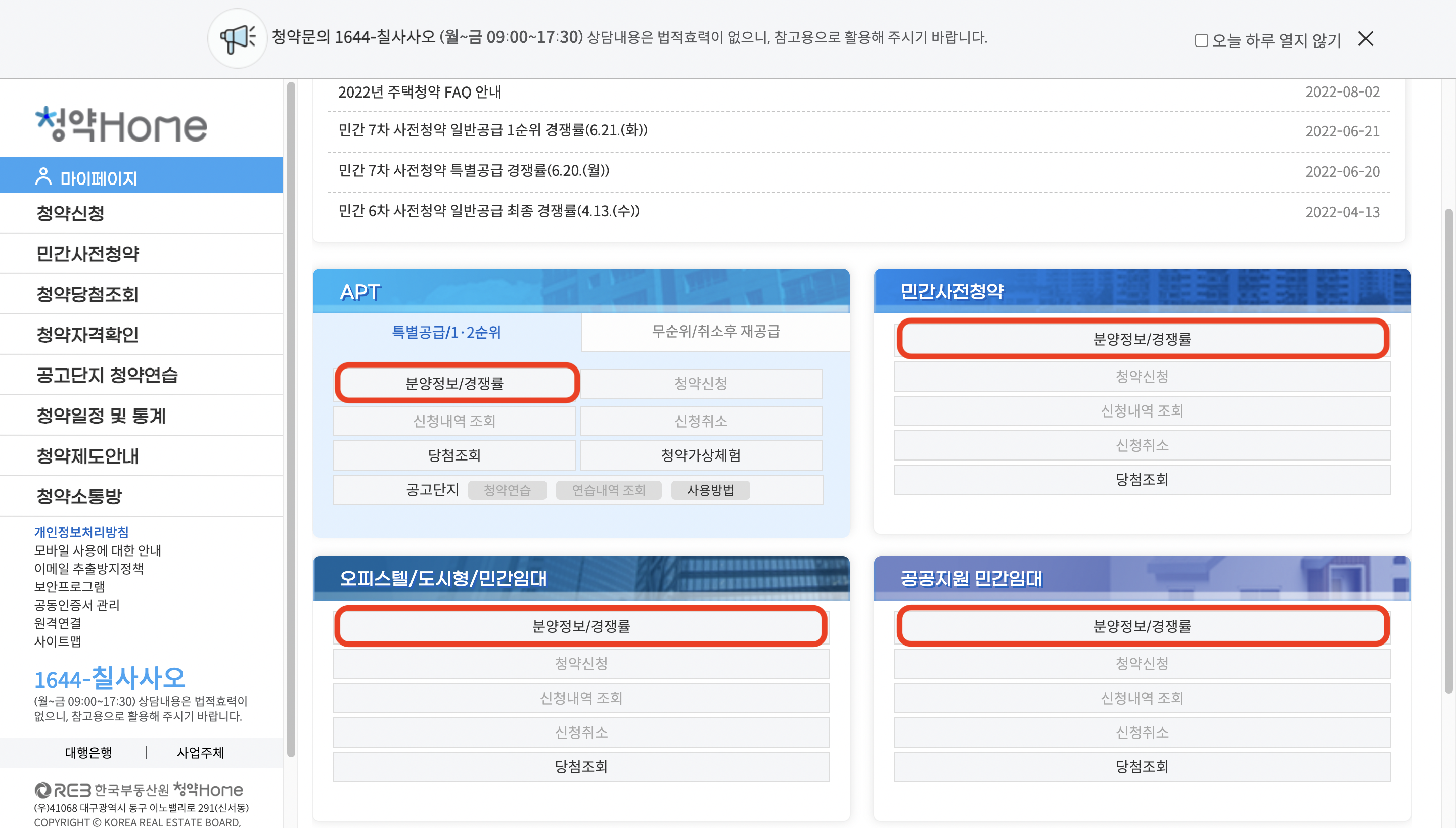 다음 방법으로는 낮은 가점 이지만 지역분석을 철저히 하여 청약 신청을 해보는 것입니다. 이 방법은 분명히 무주택 세대원에 비해서 당첨 확률은 분명히 낮은 방법이긴 합니다. 하지만 청약홈 홈페이지를 들어가서 분양정보/ 경쟁률을 충분히 확인해주는 등 철저한 지역 조사를 통해서 당첨을 노려볼수 있습니다.