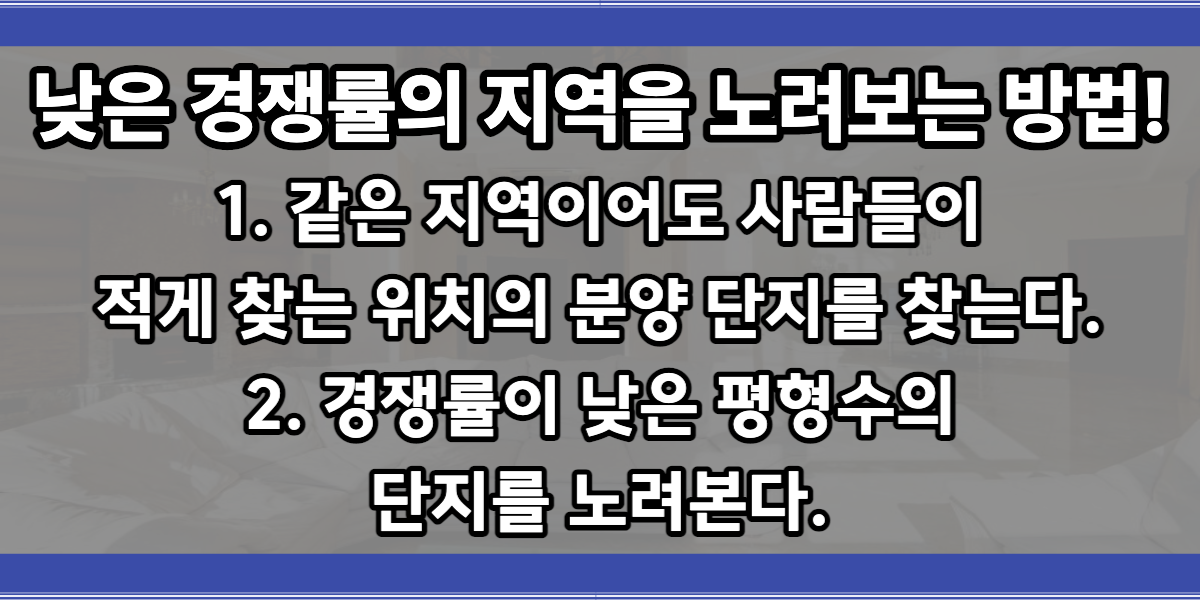 낮은 경쟁률의 지역을 노리는 것이기 때문에 사람들이 많이 몰리는 곳을 피해주는 것이 중요합니다. 같은 분양 아파트 더라도 평형수에 따라서 지원률이 달라지기도 하니까 이부분도 꼭 확인하셔서 틈새를 노리는것이 좋을것 같습니다.