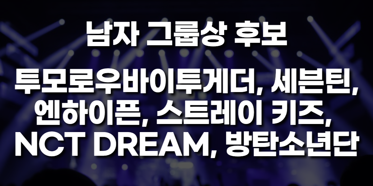 그리고 남자 그룹상 후보로는 투모로우바이투게더, 세븐틴, 엔하이픈, 스트레이 키즈, NCT DREAM, 방탄소년단이 이름을 올렸구요.