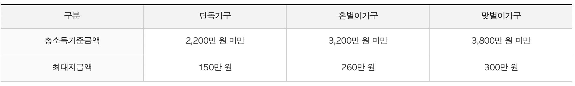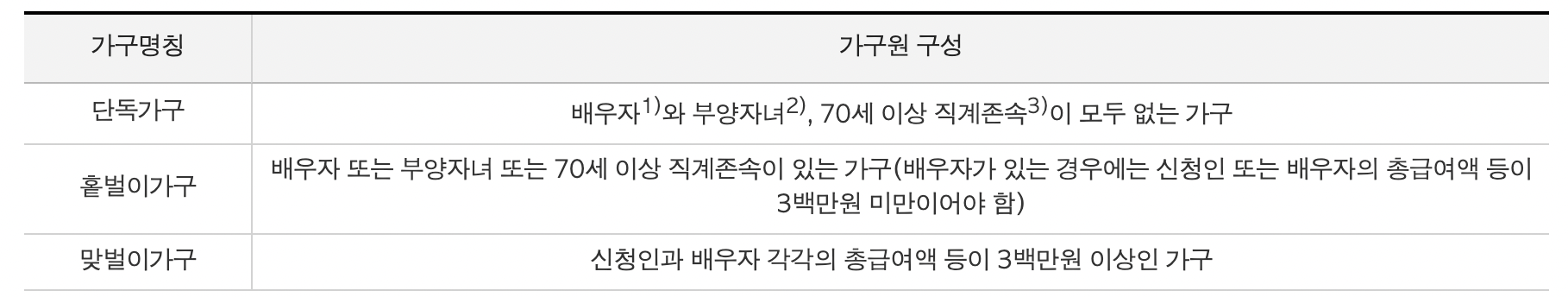 소득 요건 : 가구에 따라서 소득 요건은 모두 다릅니다.