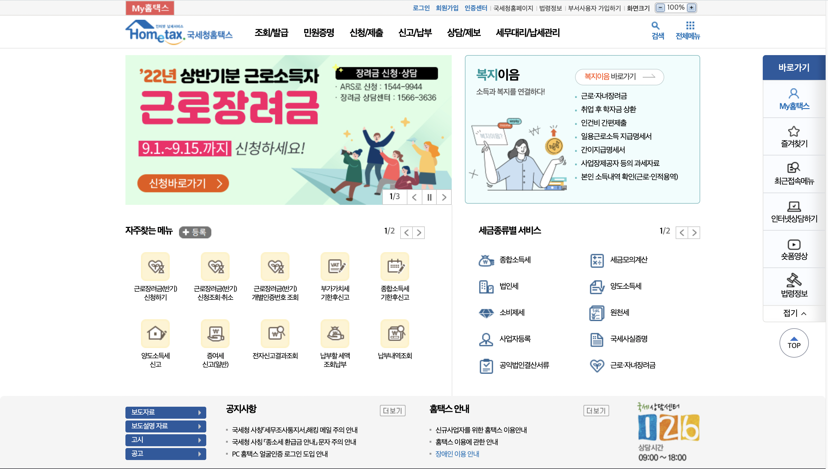 현재 홈택스에 접속하면 바로 입구 페이지에서 저렇게 근로장려금에 관련된 내용이 있으니 어렵지 않게 신청하실수 있을것입니다.