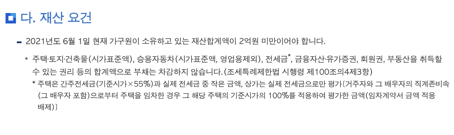 ✔︎ 소득은 2021년 기준 연간 부부합산 총소득 금액으로 계산하고 재산은 2021년 6월 1일을 기준으로 가구원의 재산합계액으로 판단합니다.