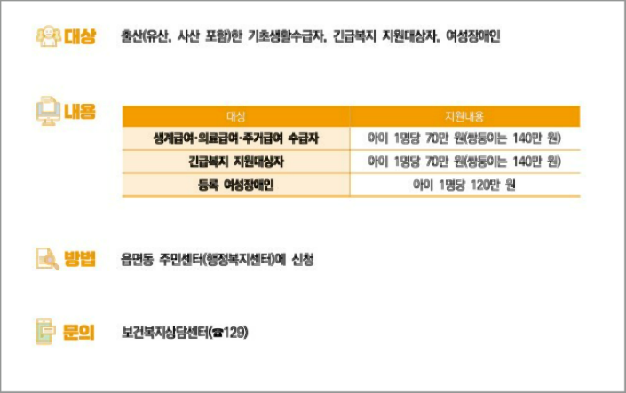 | 긴급 복지 지원 대상자 | 아이 1명단 70만원 (쌍둥이라면 140만원) |
