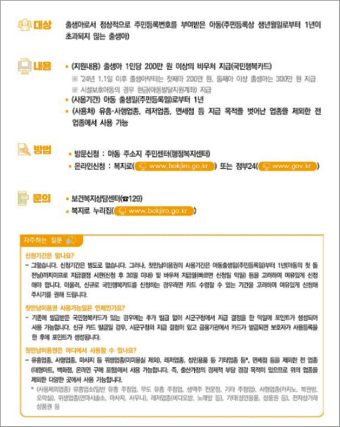 ● 내용 : 출생아 1인당 200만원 이상의 바우처 지급 (국민 행복 카드)