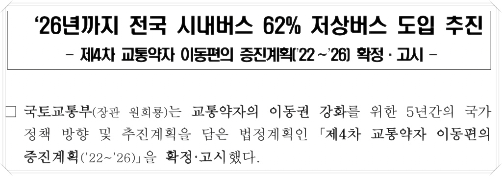 국토교통부에서 9월 27일인 오늘 나온 보도자료에 따르면 교통 약자들을 위해서 저상버스 뿐아니라 다양한 배려를 해줄것으로 예상할수 있을것 같습니다.