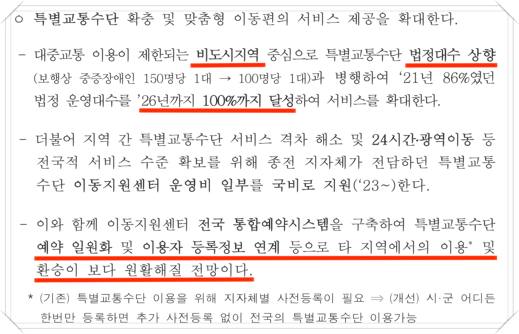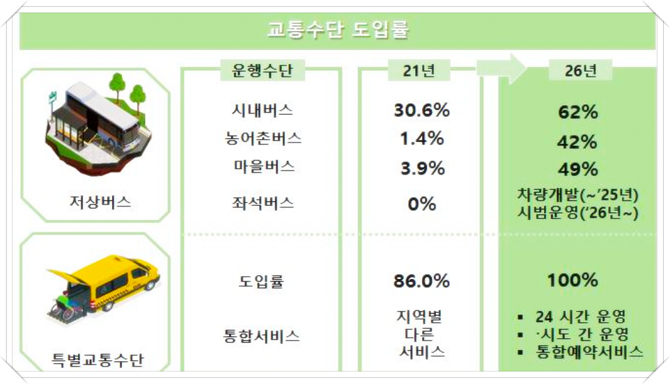 그리고 비도시지역의 특별교통수단을 100% 까지 달성하여 교통 약자들이 조금이라도 더 편리하게 이동할수있도록 할거라 말했는데요. 특별 교통수단이란 교통 약자의 이동을 지원하기 위한 교통 수단입니다. 예를 들어서 휠체어 탑승 설비등이 장착된 차량을 뜻합니다.