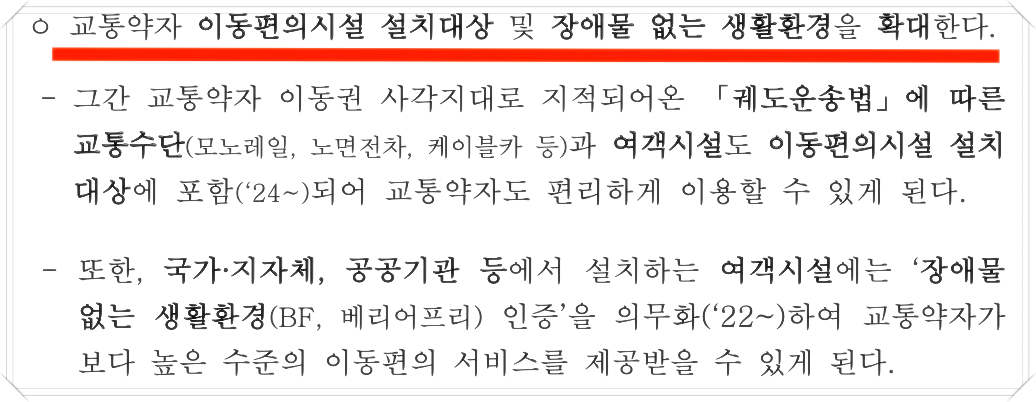 그밖에도 교통약자들이 불편해 할만한 장애물없는 환경을 조성하여 더욱더 편리한 교통환경을 만들것을 제시하였습니다.
