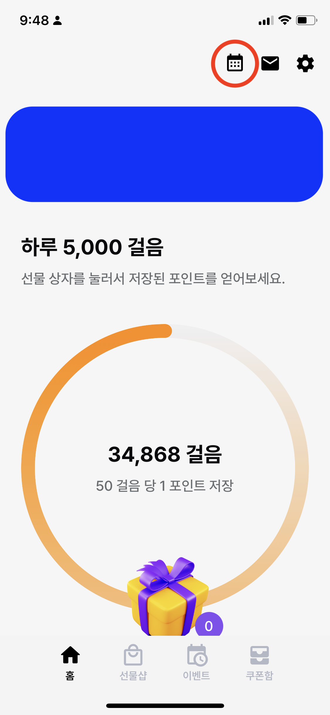 하루에 총 5000 걸음을 걸을 경우에 100 점이 쌓이게 되구요.